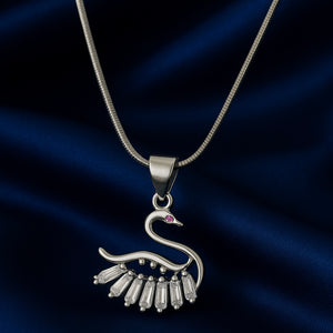 A delicate swan pendant that symbolizes elegance and serenity, this necklace is a timeless piece for everyday grace. The pendant features a swan crafted with fine detailing, highlighted by baguette-cut stones that form its flowing feathers. Perfect for those who love a touch of charm and sophistication.