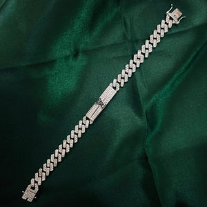 A luxurious Cuban link bracelet designed for men, featuring a bold, fully iced-out look. Each link is encrusted with shimmering stones, while the centerpiece showcases a designer-inspired clasp for added sophistication. Perfect for making a strong and stylish statement